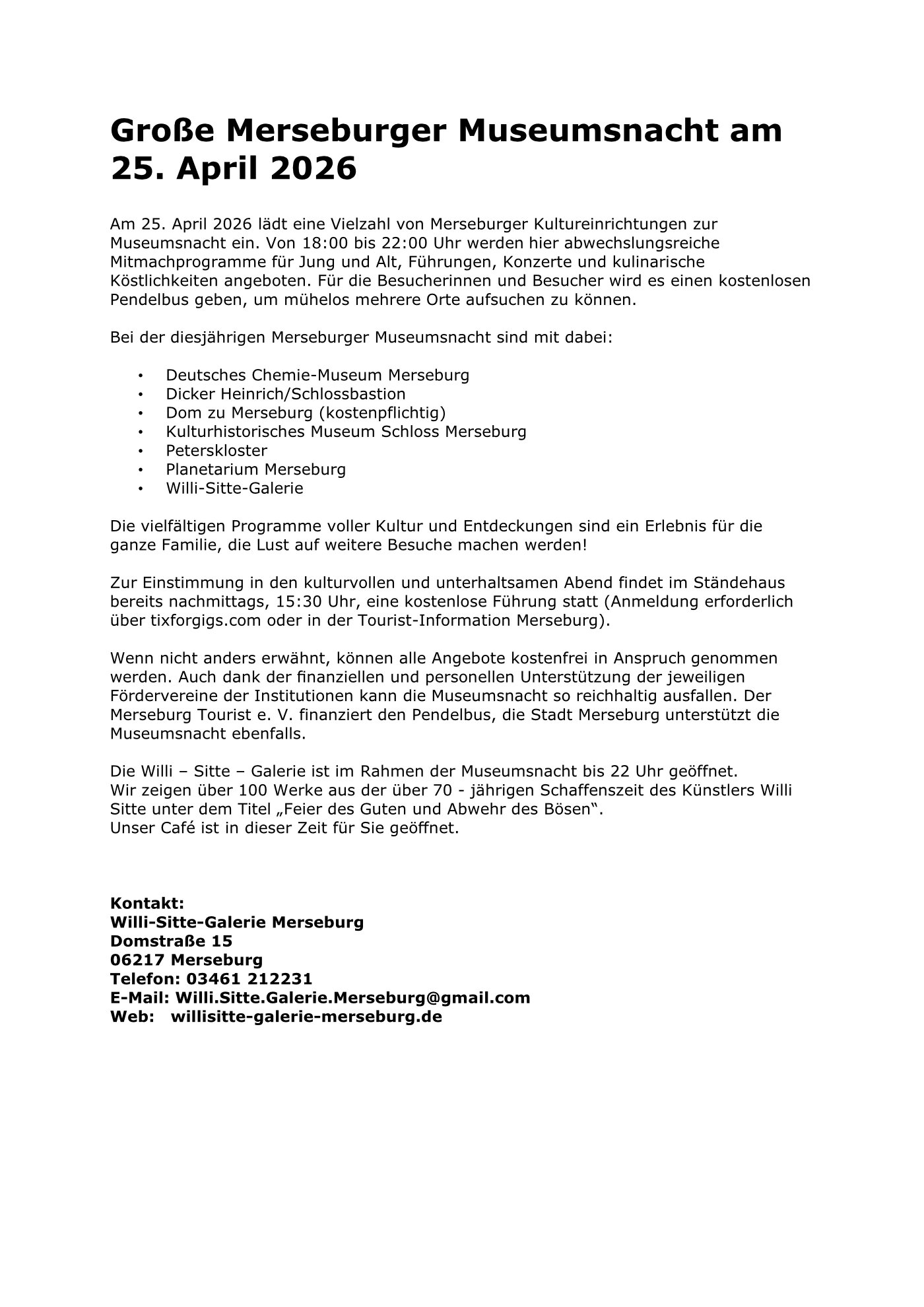 Seit dem 28.02.2006 ist die Stadt Merseburg um eine weitere touristische Attraktion – die Willi-Sitte Galerie für realistische Kunst – reicher.